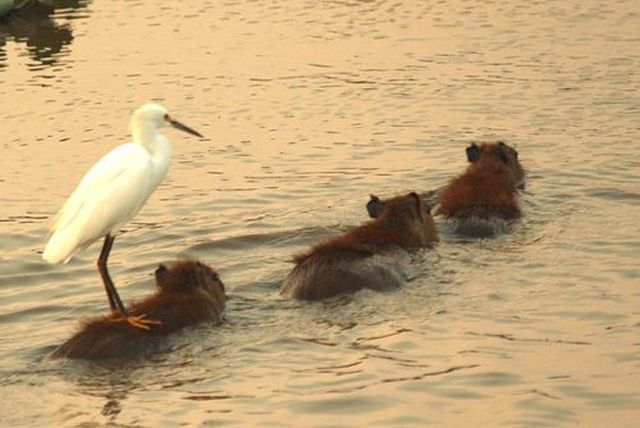Pelican is tired of flying and getting pushed by all the wildlife so she decided to jump on a swimming hyenas and get a piggyback ride for ones