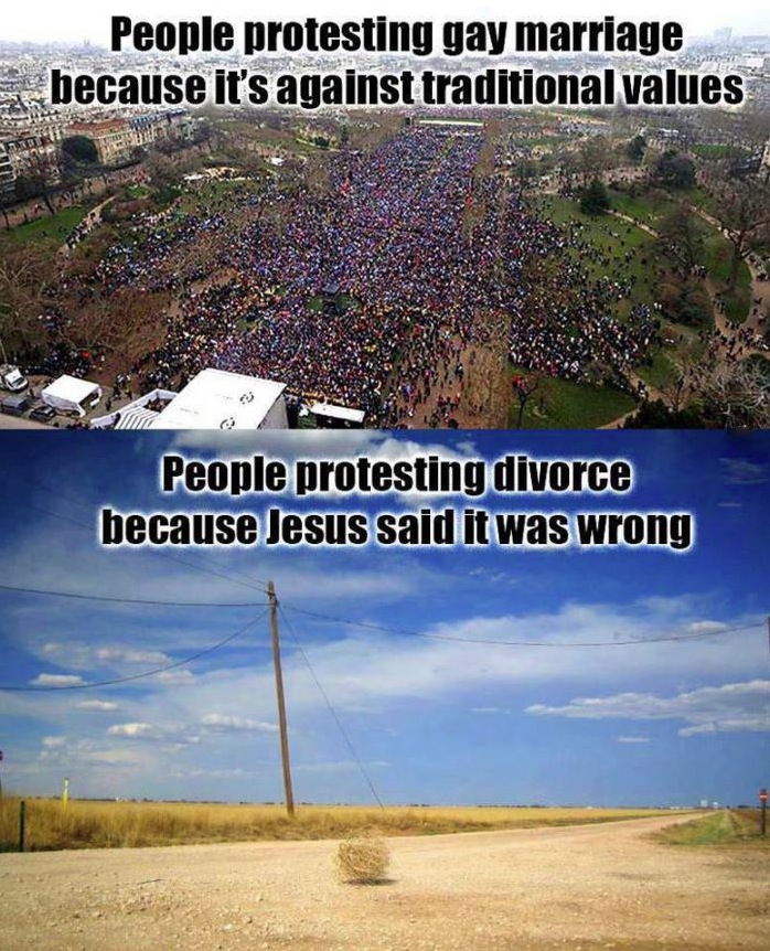 There are millions of people protesting gay marriage because it's against traditional values but zero people protesting divorce because Jesus said it was wrong.