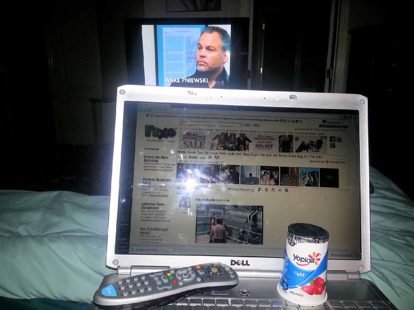 I have my computer on FAXO, yogurt, remote control, and TV on Law and Order:Criminal Intent rerun....Doesn't get much better than that. I like it !!!