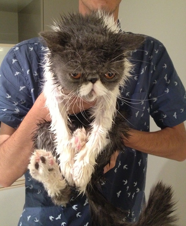 This cat does not look too happy after her bath. Never trust a man in a bird shirt. One does not simply bathe Samuel L. Catson. I'm certain this kitty plans to kill you in your sleep. She probably needs more tumble dry.