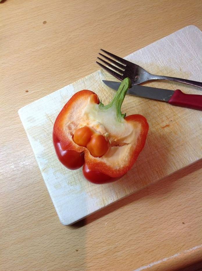 I just cut this bell pepper and noticed it has balls and a penis. I don't think I'm going to eat it because it looks too hot and spicy