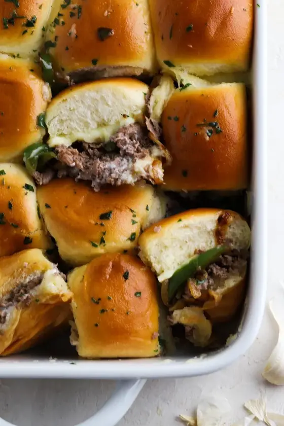 7. On top of the steak, spread the sautéed onions and bell peppers. Add the slices of cheese evenly on top. Spread any extra garlic aioli on the top sheet of slider rolls before placing the sheet on top of the cheese. Spread the melted butter with garlic and parsley on the tops of the rolls.