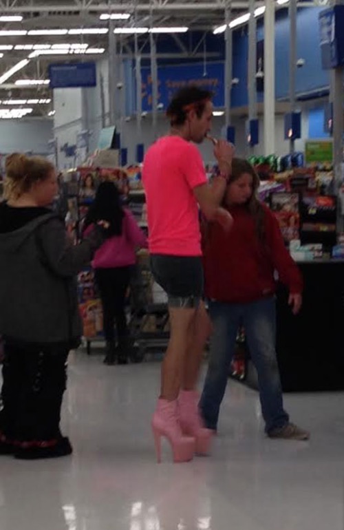 Omg. I don't think I've ever seen something this funny before. The guy looks like he's wearing mom's boots only mom's boots are making him 9 feet tall! The pink color definitely puts the finishing touches on...