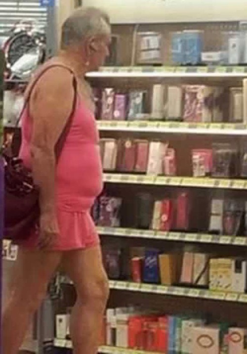 Pink Paunchy Pops Peruses Perfume at Walmart