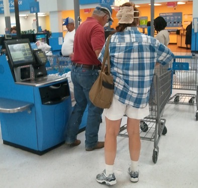 Plaid Shirt, White Shorts, and Sticks in Her Hair