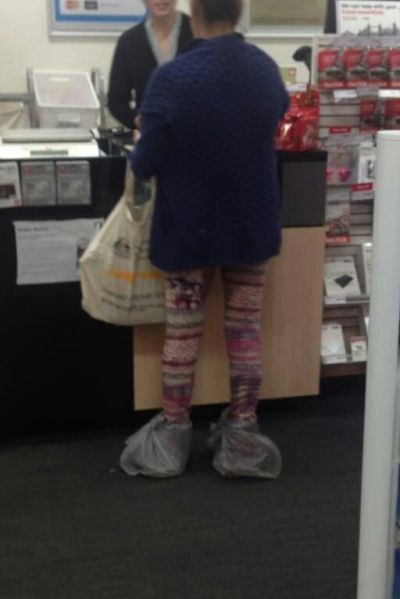 Plastic Bags for Boots and Multi-Colored Candy Striped Leggings at Walmart Fail