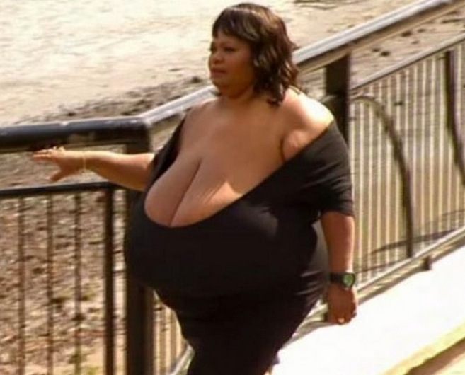 This woman defies the laws of physics. How can she stand for one? Secondly how can she walk? She must have some serious back problems. Her neckline is practically to her knees!