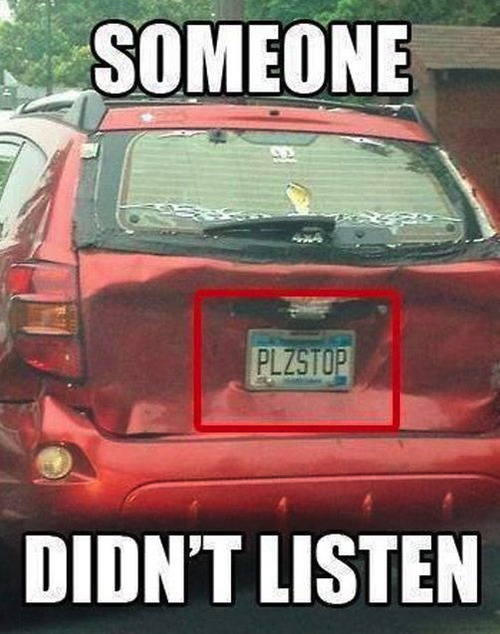 This guy has a license plate with "PLZSTOP" written on it. Apparently, the guy behind him didn't stop and rammed into this car.