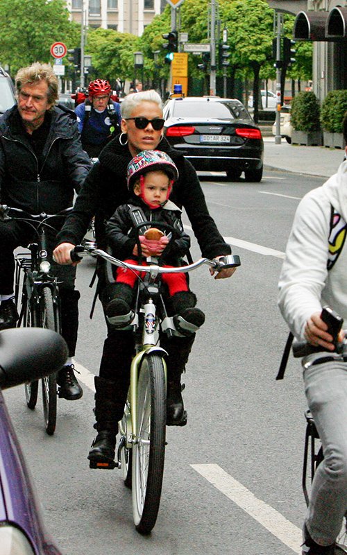 Treating herself to some sightseeing excitement, Pink hopped on a bike and rode around Berlin, German yesterday afternoon.