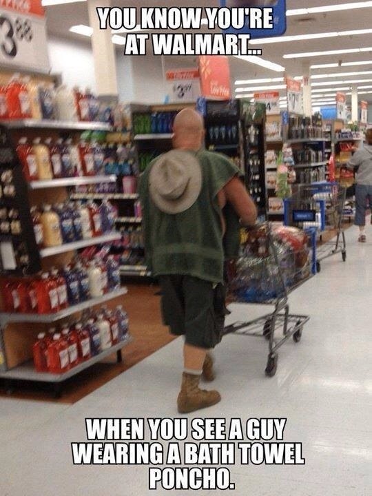 You know you're at walmart when you see a guy wearing a bath towel poncho.