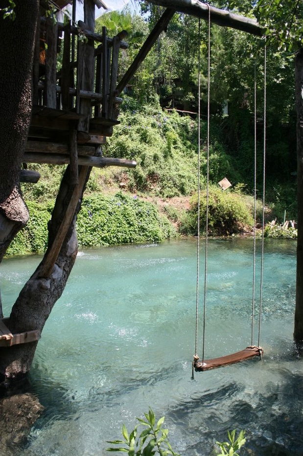 The most beautiful pool and lake ever with a swing from a tree and gorgeous water.