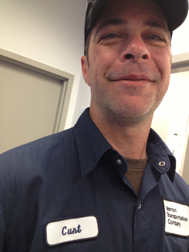 Curt's company chose the kerning font and his name tag reads "Cunt" instead of Curt. However Curt does not look upset. In fact he is smiling!
