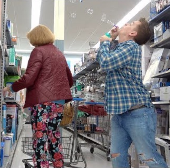 This woman is taking a bubble bath at Walmart. Batteries not included.