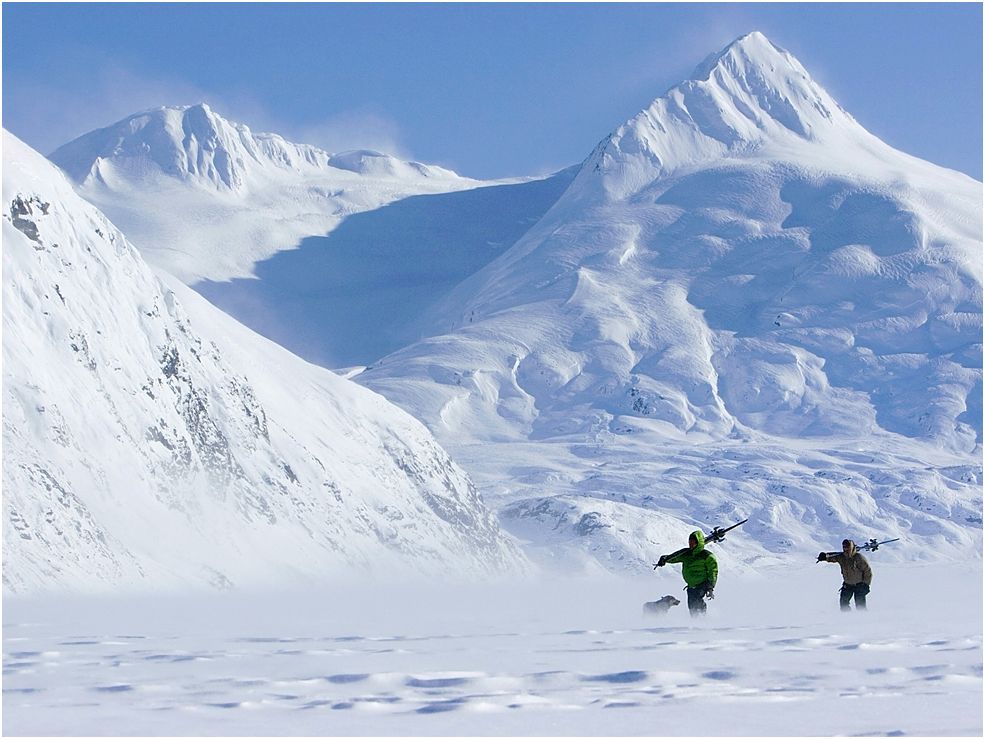 Skiers and their canine companion traverse Portage Lake in Chugach National Forest, Alaska. The lake abuts Portage Glacier and is a popular winter spot for skiing, hiking, and other icy activities.