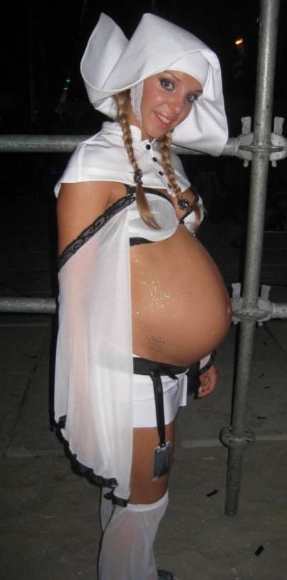 This has to be a costume in poor taste don't you think? I don't think a nun would be pregnant and go to a party. Usually they just hide that stuff