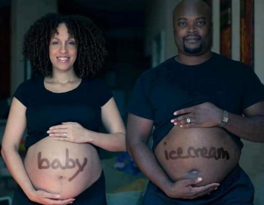 Pregnant women is having a baby that's why her stomach is growing but the men its ice cream