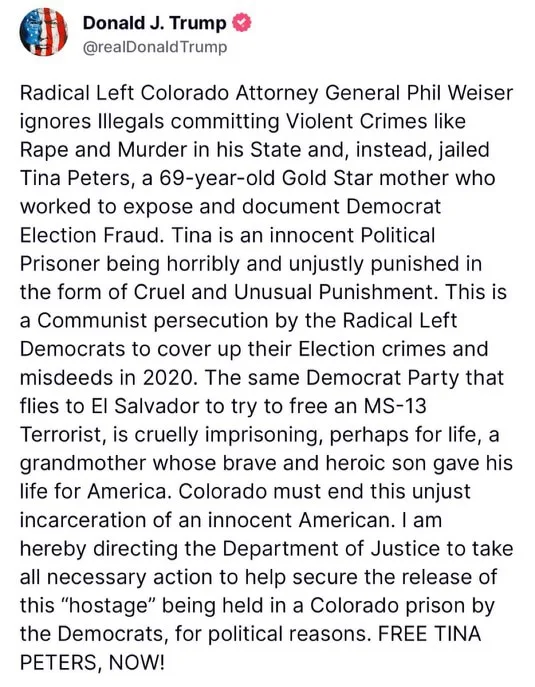 President Trump Orders DoJ to Release Tina Peters from Colorado State Prison