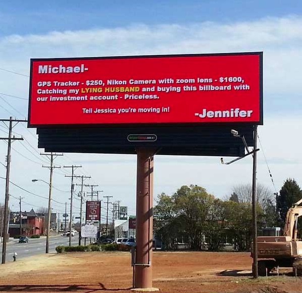 Michael- GPS Tracker $250, Nikon Camera with zoom lens $1600, Catching my lying husband and buying this billboard with our investment account - Priceless. Tell Jessica you're moving in! -Jennifer