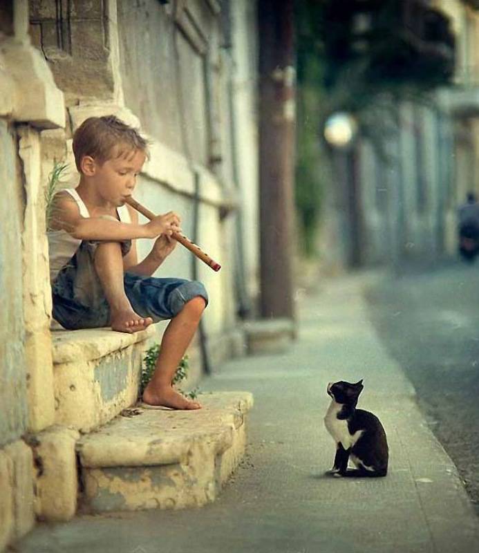 This little kitty get serenaded by a young boy playing a flute