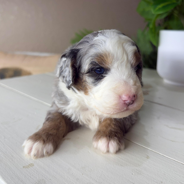 Puppy Breed: Multigen Micro Bernedoodle Date of Birth: May 9, 2025 Gender: Male Est. Adult Weight: 15 - 20 lbs Ready To Join Your Family