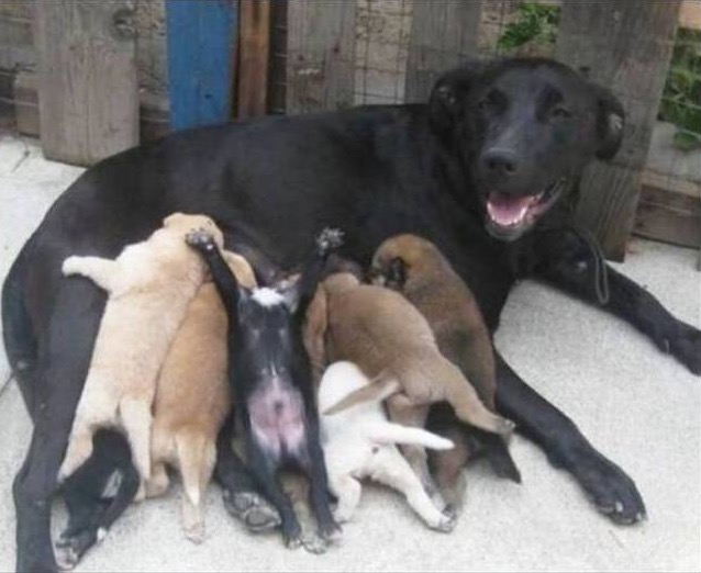 These guys really know who the special guy is. Which one of these is not like the others? Upside down so he can really fill his belly. Happy mom dog too!