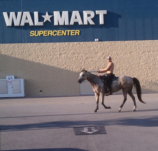 Putin is now the knew spokesperson for Walmart. I'm sure they paid him a lot to pose for this shot. The horse probably got nothing.