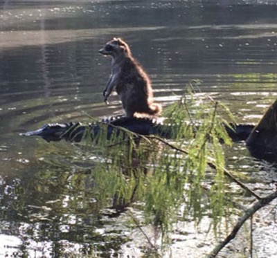 You have to think this raccoon really knows how to live life on the edge. One wrong move and he's lunch meat. Maybe he thinks he's on a piece of wood?