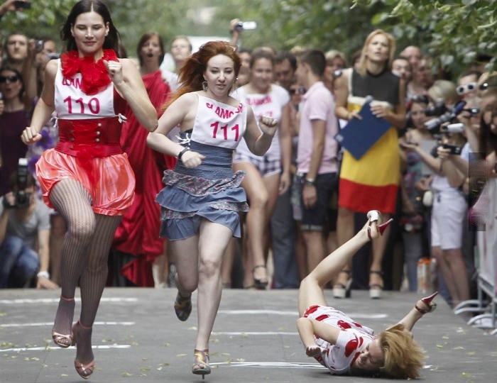 The only thing worse than running in high heels is running in high heels and falling on your face! High heels running fail.