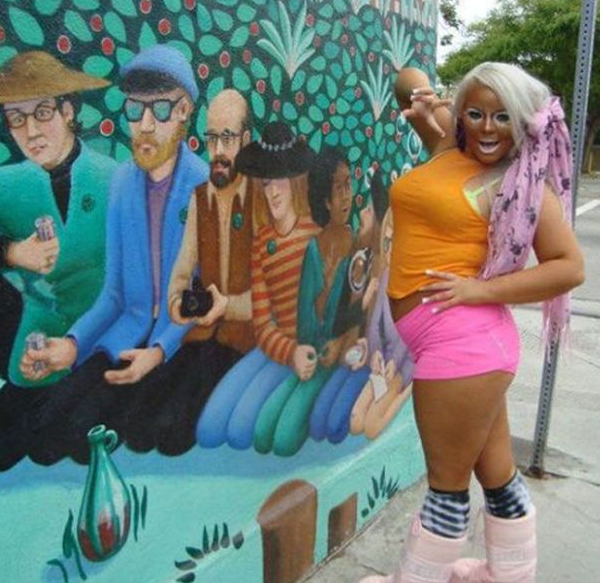 Woman posing next to the art wall, and she has so much make up on you can't even see her face and Ill wont say nothing about her close its just offel.