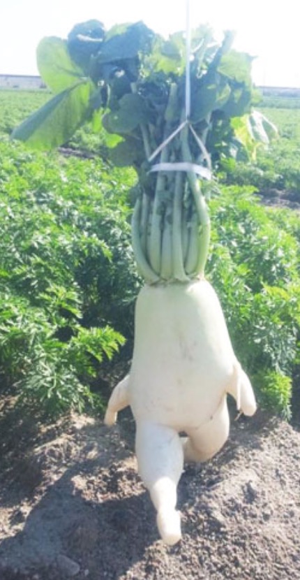 This radish is stepping out in style. It looks like her hair is all done up and she's ready to paint the town red. I suspect she'll end up soup by nights end.