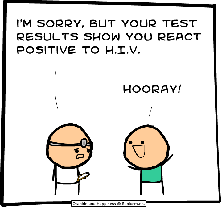 Oh such a witty and pun-ny comic. Reacting "positively" to HIV can be understood in both a medical and emotional context, I guess. At least he has a positive disposition on his current predicament.