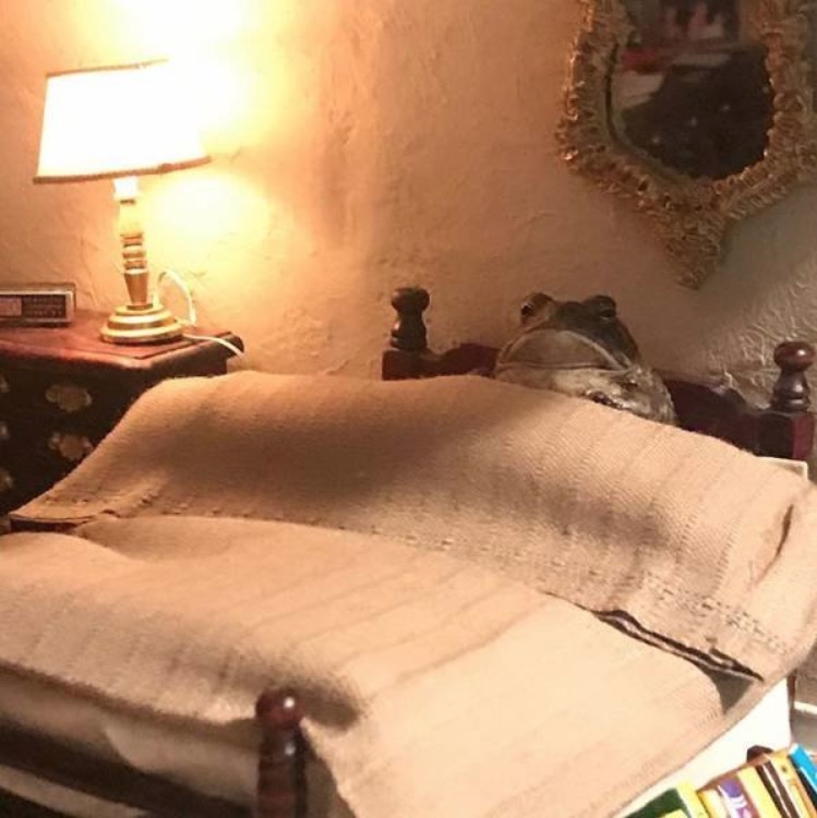 My giant frog is ready for bed. He's all tucked in and waiting for his kiss goodnight.