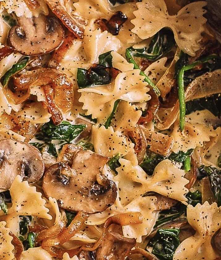 Farfalle Pasta with Spinach, Mushrooms, and Caramelized Onions
