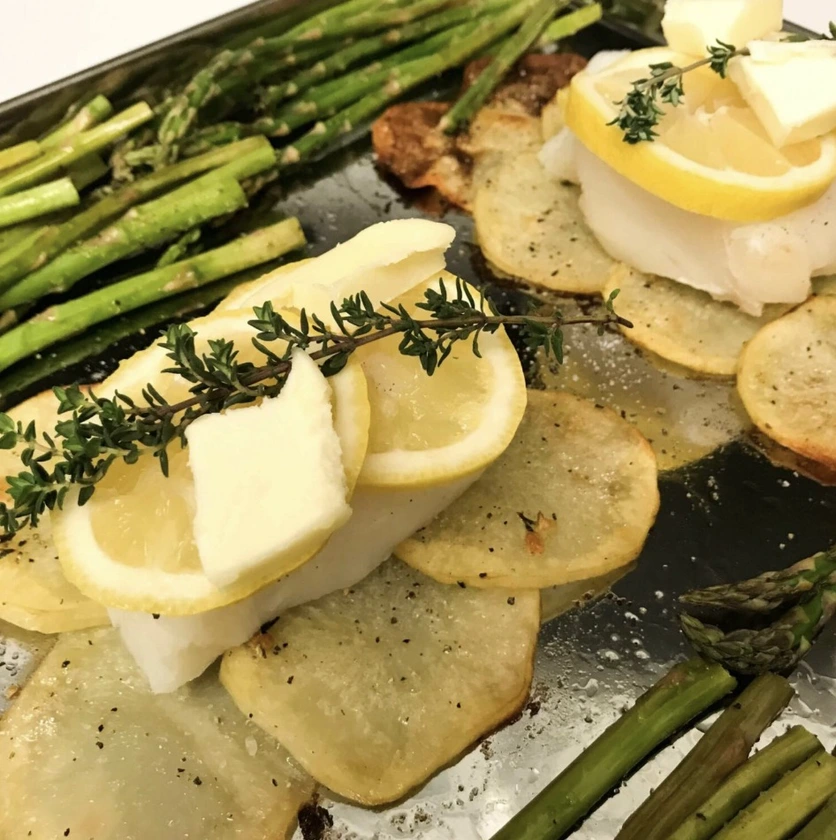 Make your whole meal easily and quickly on a sheet pan in the oven. The cod and sliced potatoes are are perfectly baked in a lemon-butter sauce with fresh asparagus. Plus, clean up is a breeze.