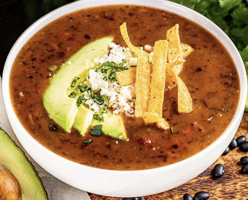 Serve hot, topped with tortilla strips or chips, and topping of choice like diced avocado, Cotija cheese, Mexica crema and cilantro.