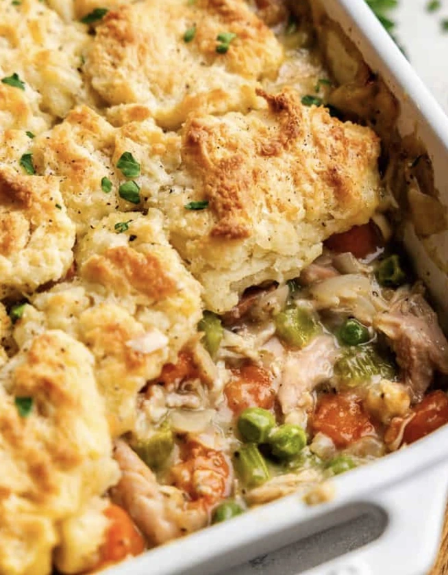 Making chicken pot pie has never been easier when you make this chicken pot pie casserole. It tastes just like the classic dish, but is much easier to prepare. It has a creamy filling with vegetables and chicken and topped with a fluffy biscuit topping.