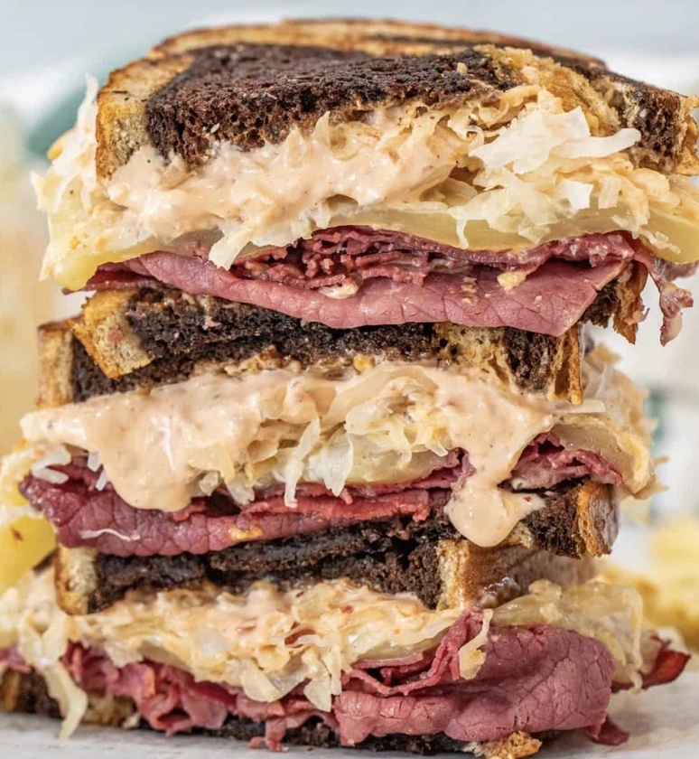 Make your own reuben sandwiches that rival any restaurant's. They're made with corned beef, sauerkraut, Swiss cheese and a homemade Russian dressing in between store bought dark rye bread.