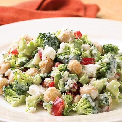 2 Add broccoli, chickpeas and bell pepper; toss to coat. Serve at room temperature or chilled.