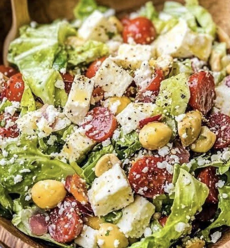 This salad was made famous and went viral because of Kim Kardashian. It's made with crisp lettuce, Mozzarella cheese, garbanzo beans, salami, red onion and tomatoes with a zesty vinaigrette drizzled on top.