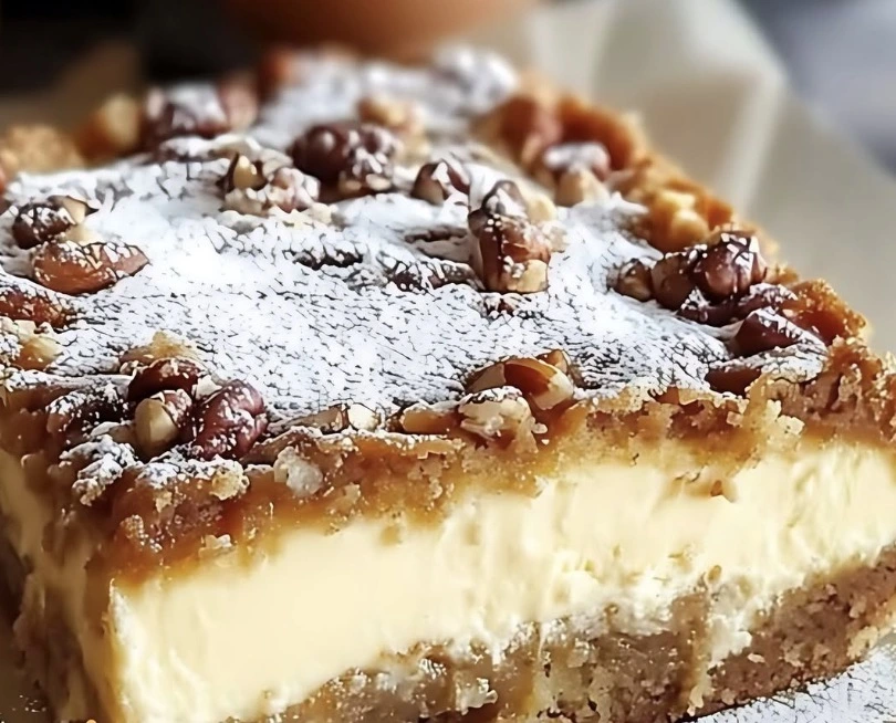 In another bowl, beat the softened cream cheese, powdered sugar, and 1 egg until smooth and creamy. Pour the cream cheese mixture over the cake batter in the pan, spreading it out evenly.