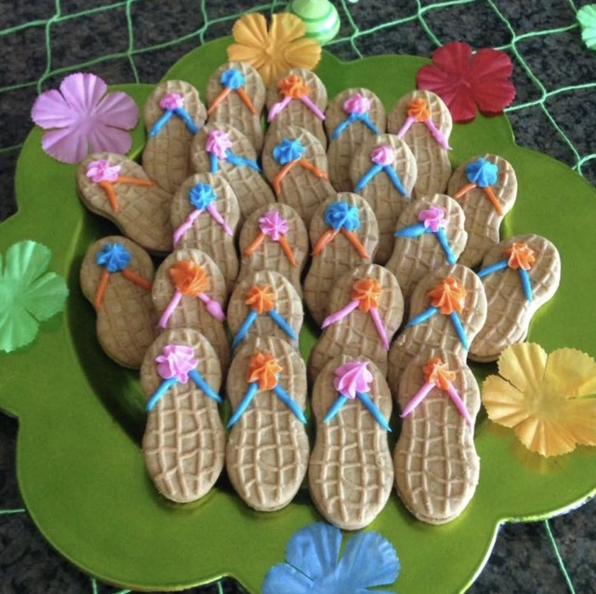 Pipe the chocolate onto each cookie to resemble the thong of a flip flop. Place a sprinkle flower or other edible decor into the middle of the piped straps.