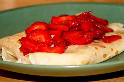 To serve, fold crepes into quarters and top with strawberry syrup.