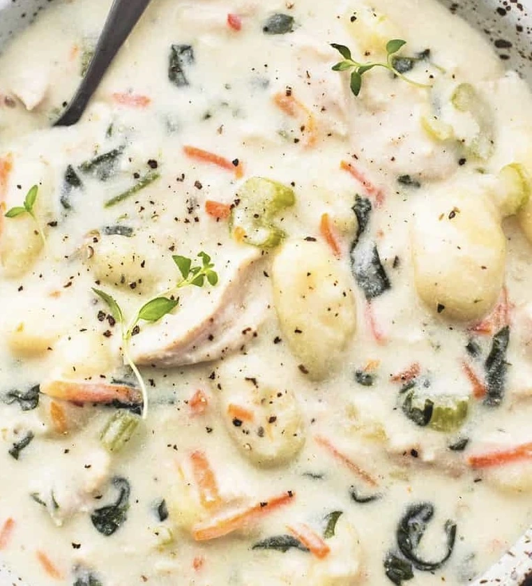 Add chicken, chicken broth, salt, pepper, and thyme; bring to a boil. Gently stir in gnocchi; boil for 3-4 minutes; reduce heat to a simmer; cook 10 minutes.