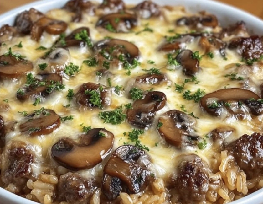Creamy Ground Beef and Mushroom Rice Bake