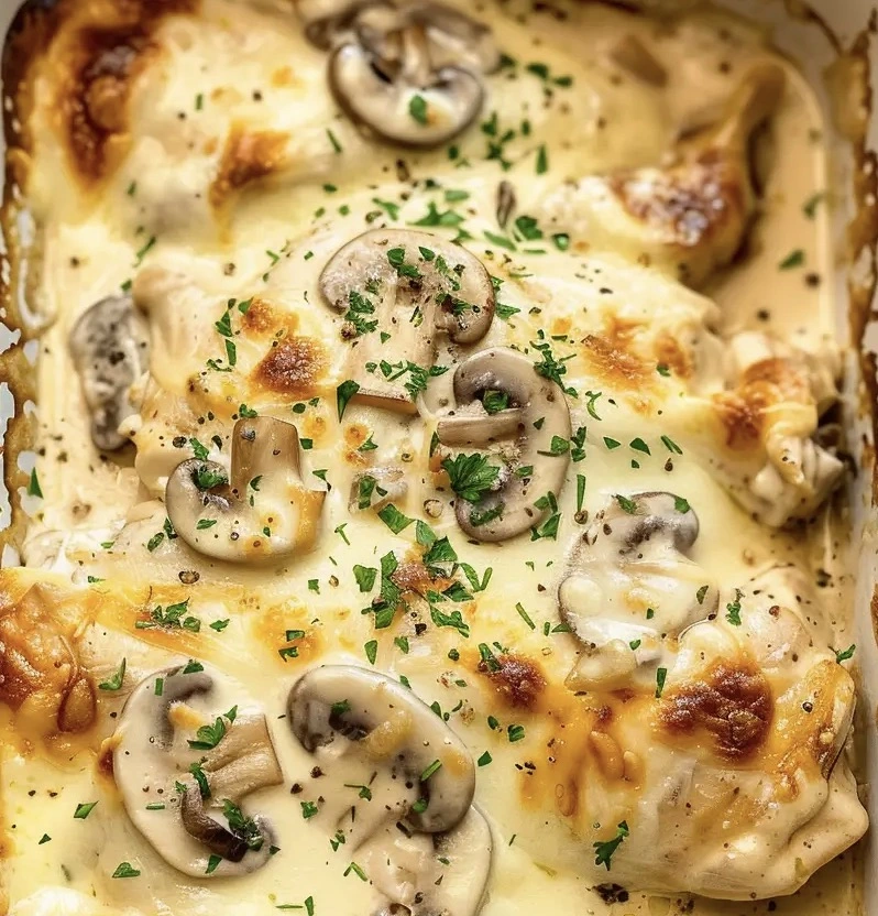 Pour the cream sauce over the chicken and mushrooms. Top the chicken with the cheese slices. Cover the casserole with aluminum foil.