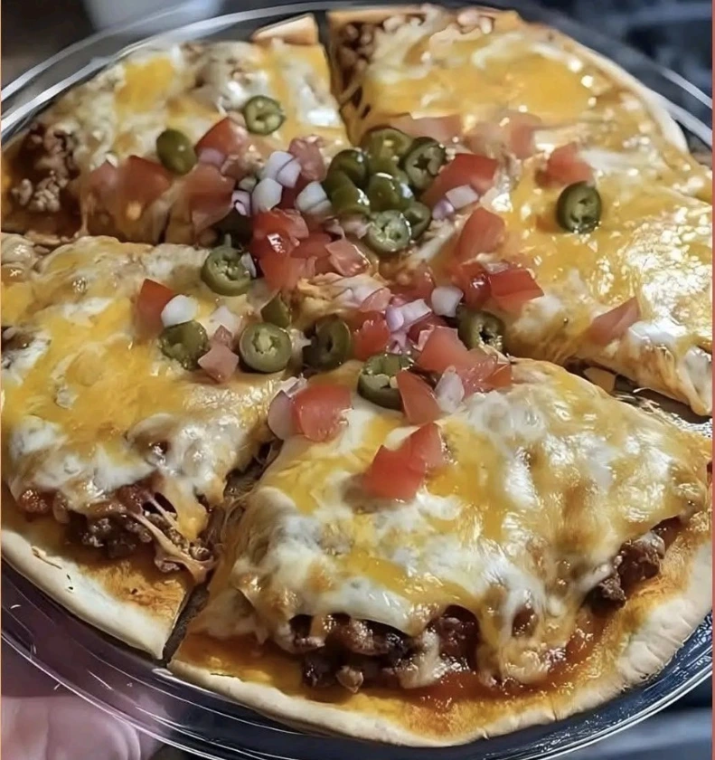 These unique pizzas are a combination of two of your favorite comfort foods, tacos and pizza. They're loaded with seasoned taco meat, refried beans, cheese, enchilada sauce amd toppings of green onion, black olives and diced tomatoes baked on top of crisp