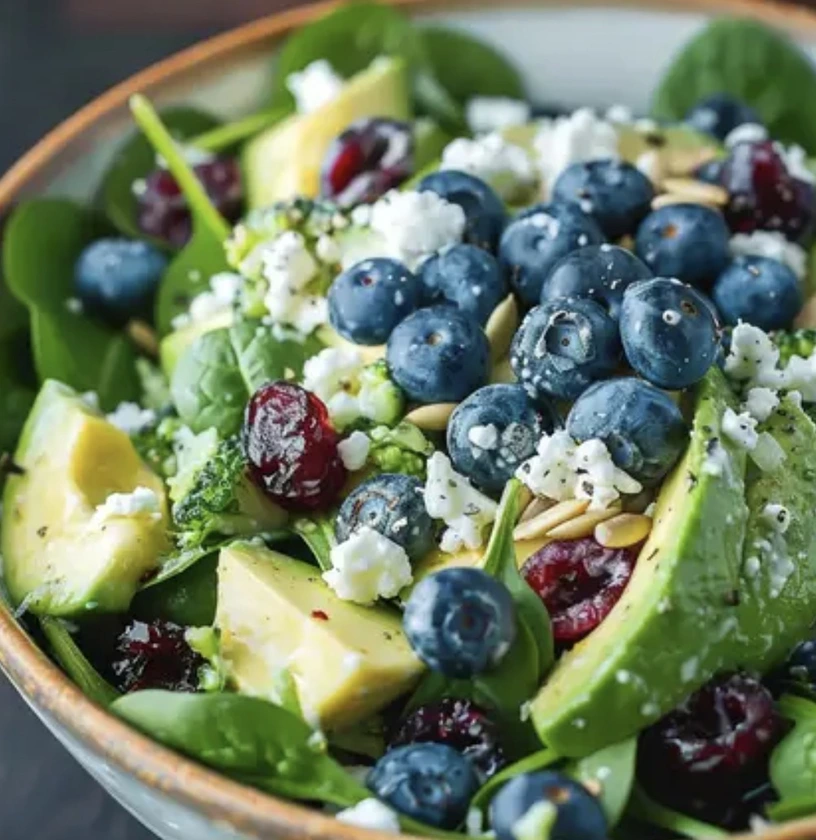 In a large bowl, combine spinach, broccoli, avocado, blueberries, cranberries, Feta cheese, and sunflower seeds.