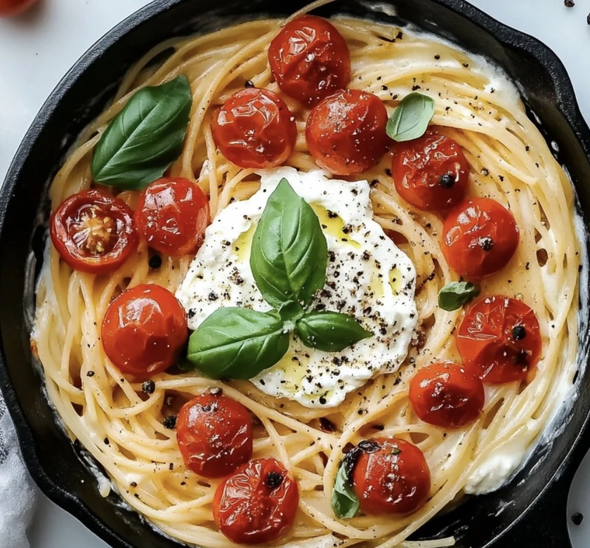 Gently smash the roasted tomatoes to release the juices. Combine the tomatoes and juices with the cooked pasta.