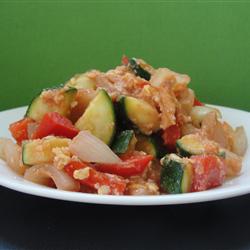 This is one of my favorite dishes to make whenever I have some zucchini on hand. Some people tell me that it doesn't look so good, but once you try it, I think you'll like it. The mixture of vegetables, eggs, peppers and tomato sauce gives it color, besid