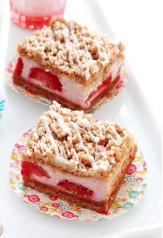 This super delicious dessert is a combination of strawberry cheesecake and strawberry shortcake. It has a surprise super creamy banana cheesecake filling and a little sliced strawberries to boot with a little dry yellow cake mix and pureed strawberries. F